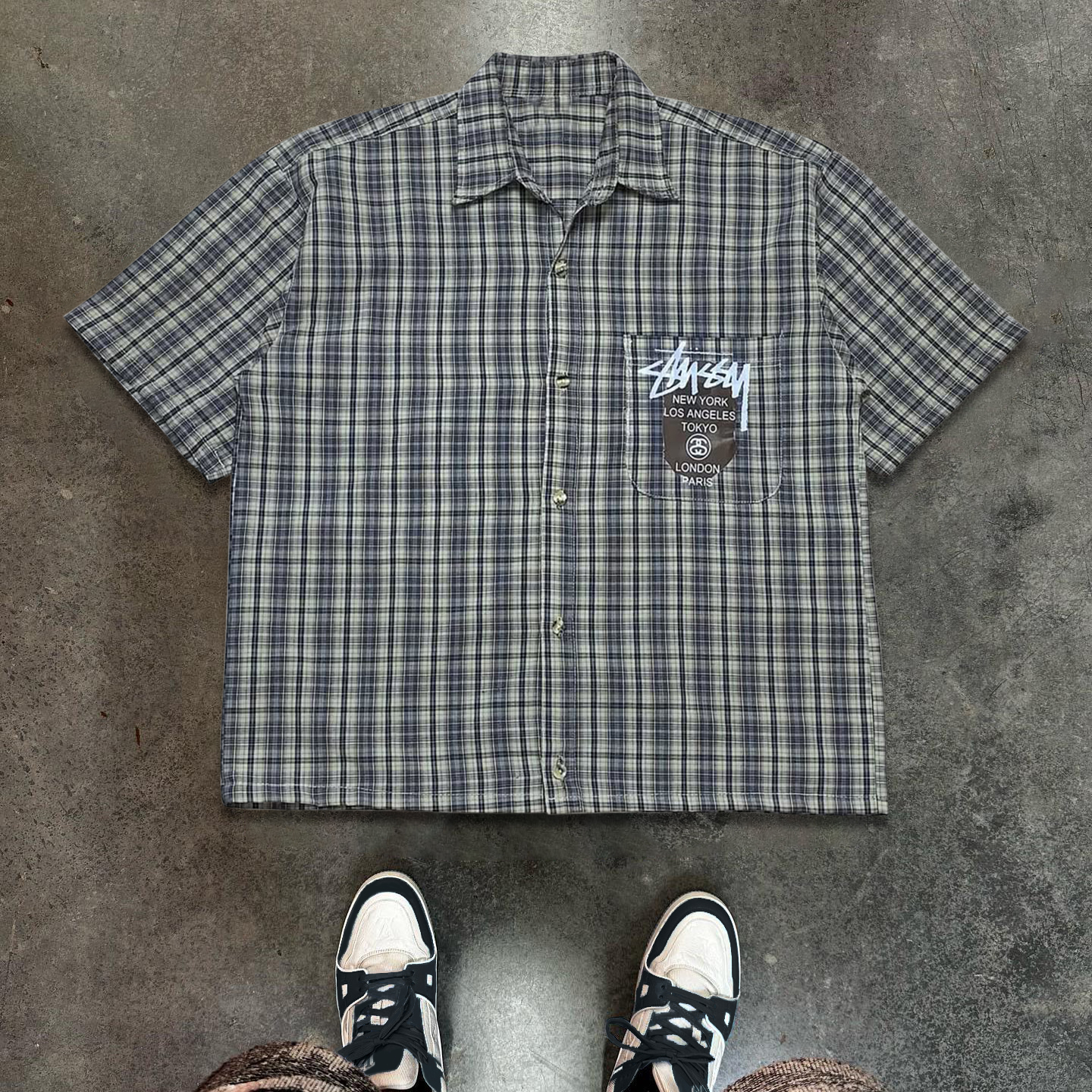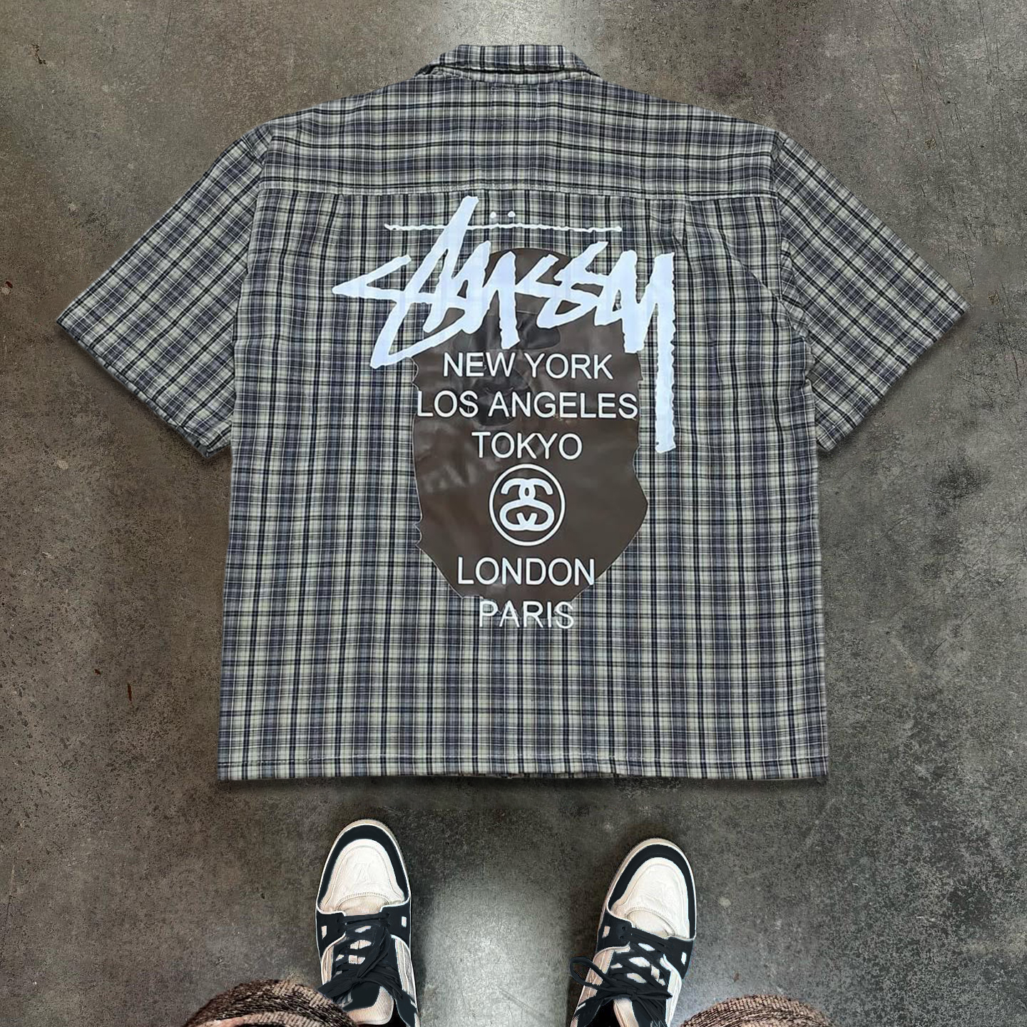 Letters Plaid Print Button Short Sleeve Shirt