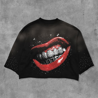 Lips And Gold Teeth Printed Three-quarter Sleeve T-shirt