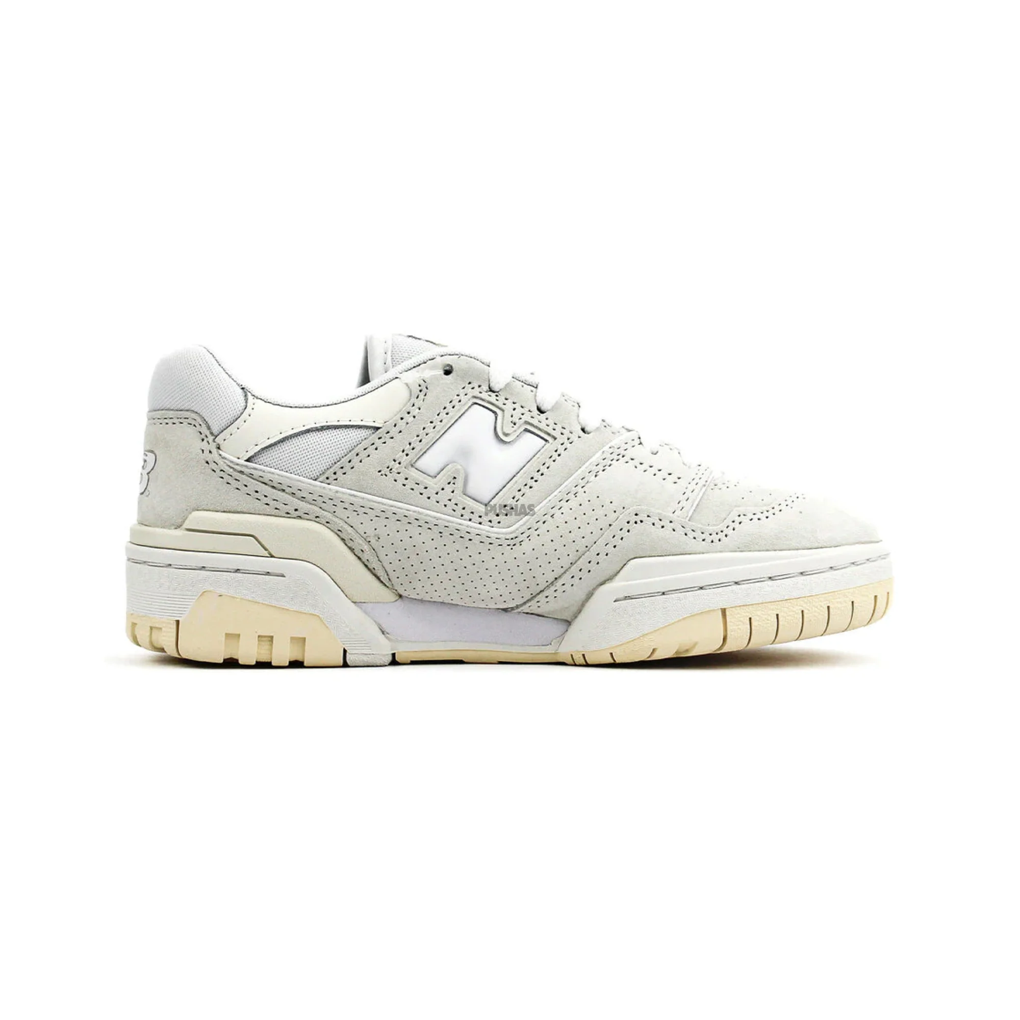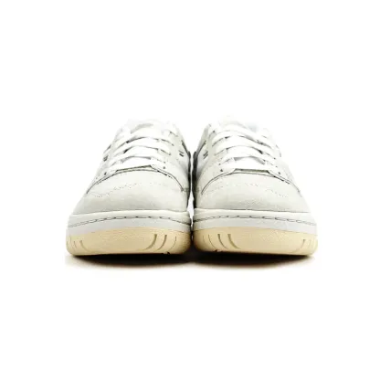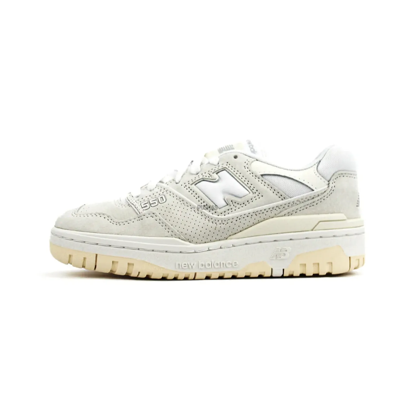 The New Balance 550 'Sea Salt Macadamia Nut' features a premium "Sea Salt" leather upper, contrasted with soft "Macadamia Nut" suede overlays that enhance the shoe's textured appeal. The muted, off-white tones create a minimalist aesthetic, while perforated detailing along the mid-panel adds breathability and depth. The vintage-inspired design is completed with the brand’s signature "N" logo, embroidered in white to maintain a clean and cohesive look. A durable rubber outsole in light beige complements the upper, offering stability and traction without compromising style. This iteration perfectly balances New Balance's heritage with a modern twist, making it a must-have for those who appreciate subtle yet refined footwear.
