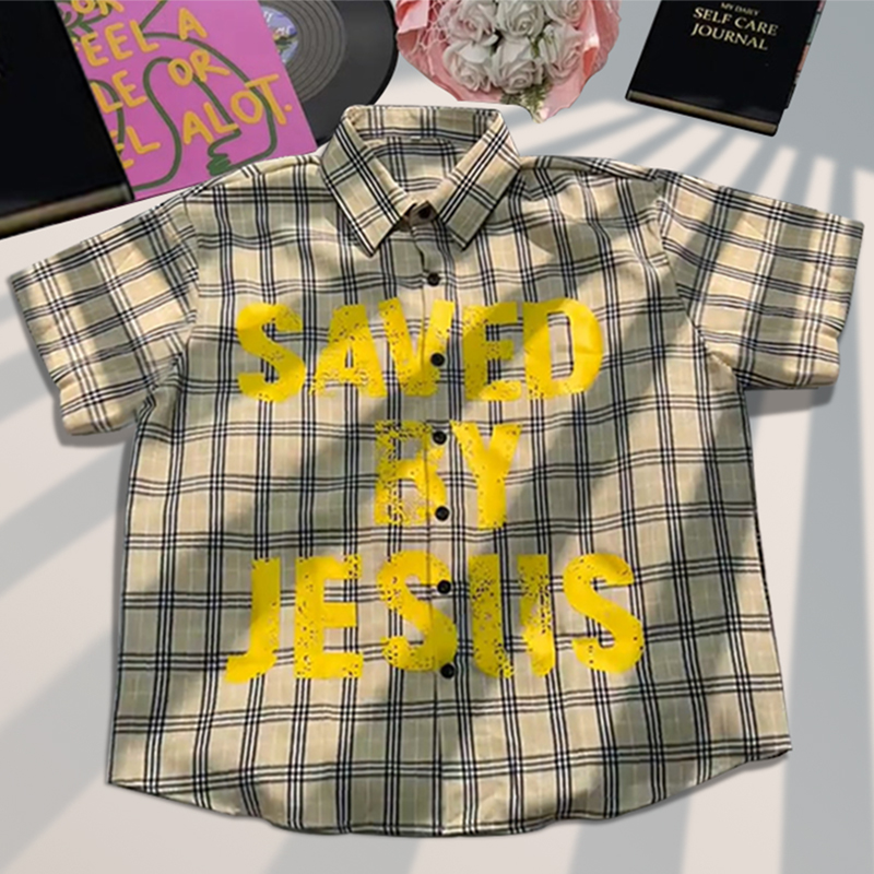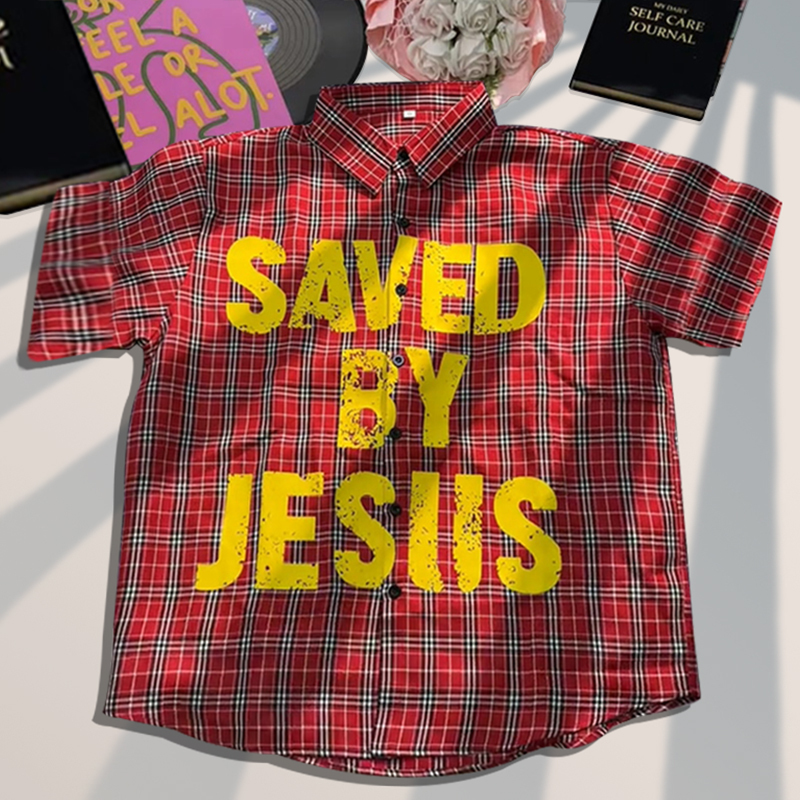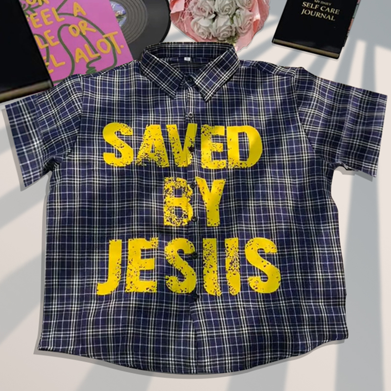 Plaid lapel saved by jesus shirt